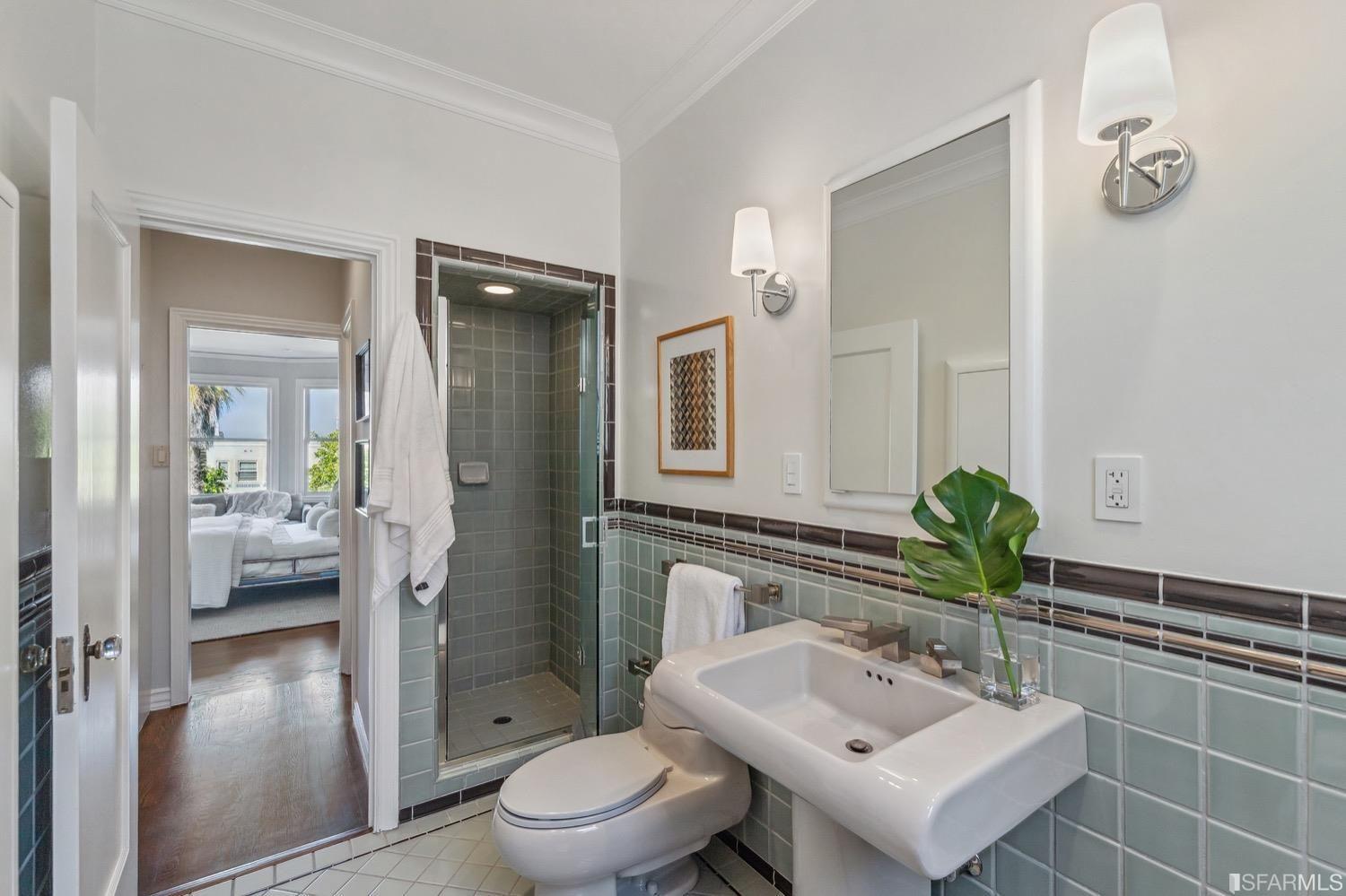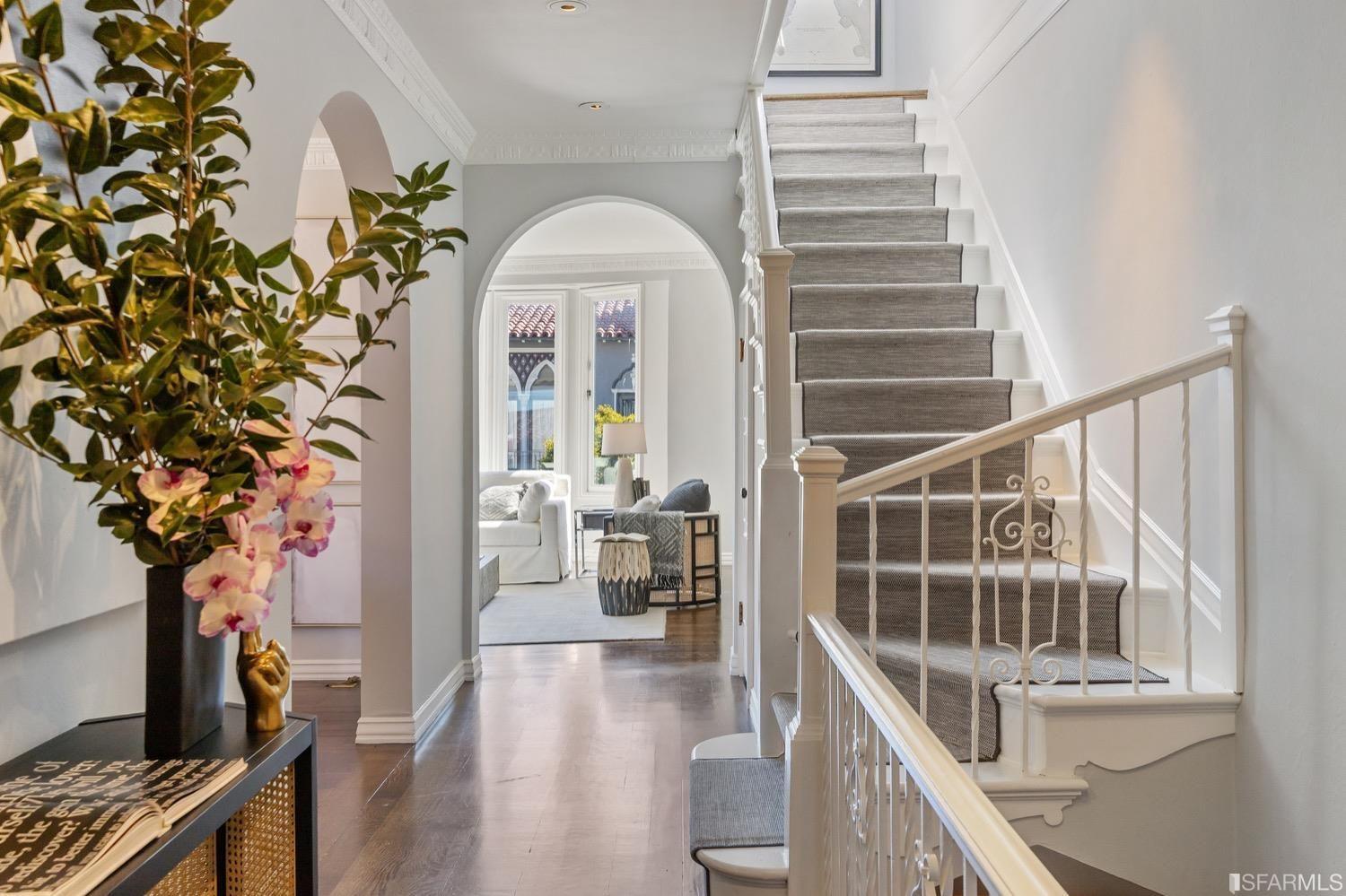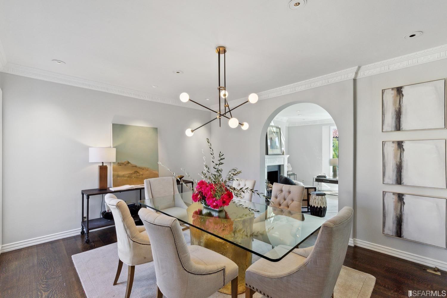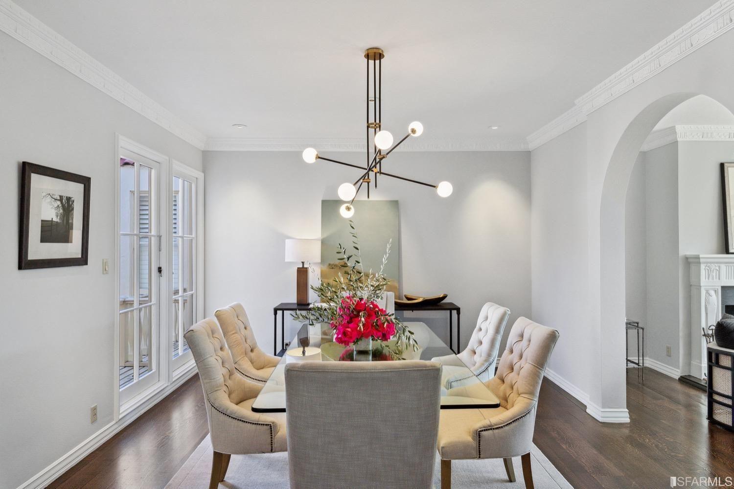 1456 Jefferson St is a spacious house-like condo in the renown Marina district. Situated on 2 levels, the property features Bay/Bridge views. The enticing living rm is flooded w/ southern light and is centered on a wd burning frplc. Through a graceful archway, the formal dining rm w/ balcony provides a generous entertaining space. The main floor has gleaming hardwood flrs. Eat-in kitchen w/ Calacatta Statuario countertops and bright & airy, casual dining area. The laundry rm is conveniently tucked alongside the kitchen w/ extra storage. Proceeding down the quintessential Jorgensen curved hallway, the primary ste overlooks the deep shared garden. Through a walk-in closet is an en-suite bath w/ separate shower & tub, and features Batchelder tile characteristic of the 1930's. A lrg guest bdrm also overlooks the yard while a 3rd bdrm is along the hallway. A hallway bath w/tub services these 2 bdrms. On the top flr is an expansive, entertaining space w/ wet bar and walk-out access to a deck with views of Alcatraz, The Golden Gate Bridge and the Bay. Additional lrg rm w/ full bath currently shown as an office with a charming, inviting window seat looking South towards Cow Hollow, Pac. Hghts & Sutro Tower. 1 car pkg