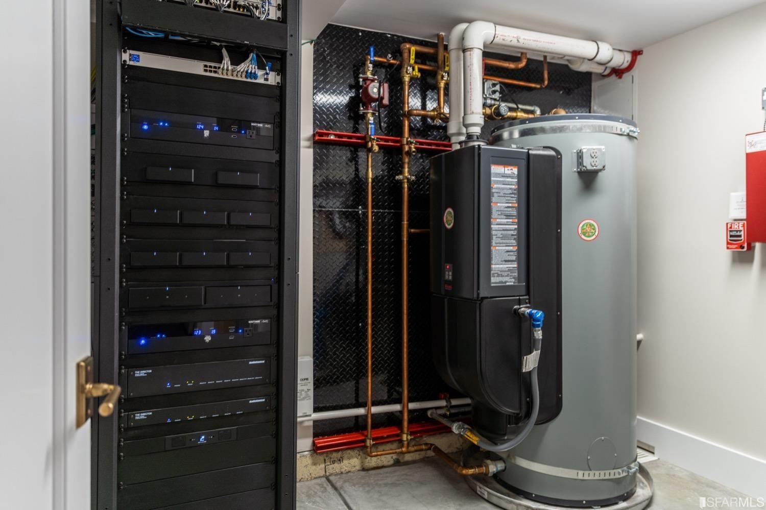 Punctuated by arched windows with hidden powered blackout shades for ultimate privacy, a fireplace-clad primary suite at the third floor provides a luxurious haven. An airy special expanse with views of The Bay and Cow Hollow, the sumptuous retreat affords two walk-in closets and two spa-like bathrooms. One bathroom features a soaking tub, and both gleam with brass Waterworks fixtures throughout. Down the hallway, common chores become a pleasure in the laundry room with abundant storage. With views of the peaceful Presidio, two additional ensuite bedrooms are also furnished with powered blackout shades providing the perfect environment for slumber.